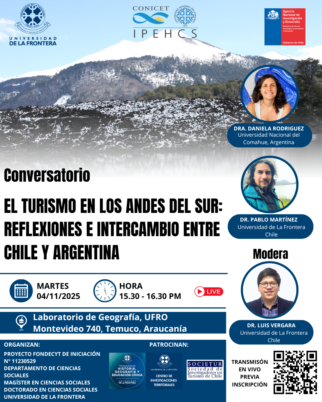 El Proyecto Fondecyt de Iniciación N°11230529, el Departamento de Ciencias Sociales, el Magíster en Ciencias Sociales y el Doctorado en Ciencias Sociales de la Universidad de La Frontera invitan cordialmente a participar en el Conversatorio internacional “El turismo en los Andes del Sur: reflexiones e intercambio entre Chile y Argentina”, instancia que reunirá a investigadoras e investigadores de ambos países para dialogar sobre los desafíos contemporáneos del turismo.