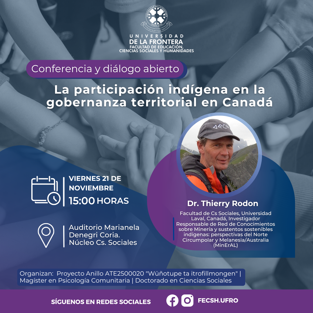 El Doctorado en Ciencias Sociales de la Universidad de La Frontera invita a la comunidad académica y estudiantil a participar en la conferencia y diálogo abierto “La participación indígena en la gobernanza territorial en Canadá”, a cargo del Dr. Thierry Rodon, académico de la Facultad de Ciencias Sociales de la Universidad Laval (Canadá) y reconocido investigador en gobernanza indígena, minería y sustentos sostenibles en el Norte Circumpolar y Oceanía.